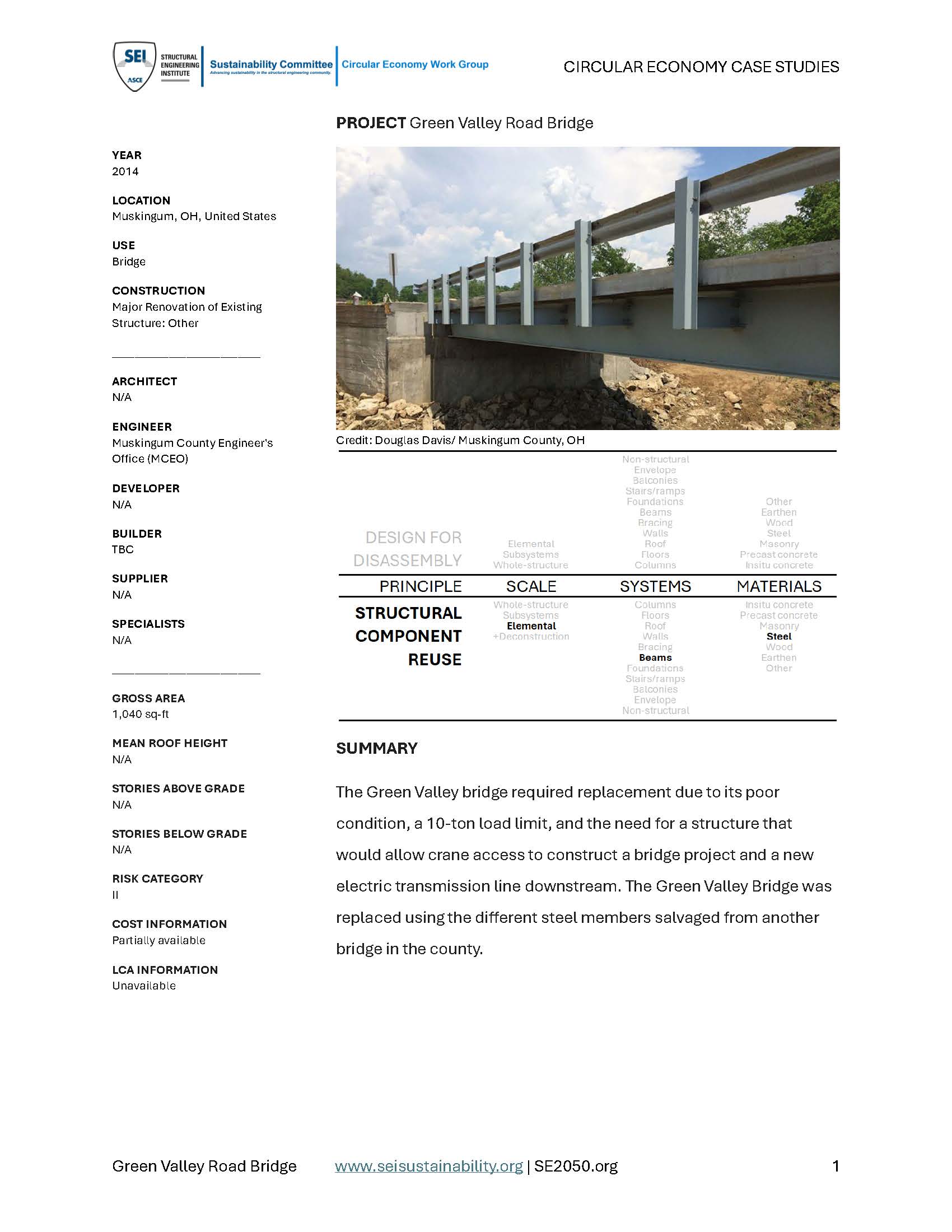 The Circular Economy Case Studies database has been prepared by the Structural Engineering Institute Sustainability Committee Circular Economy Work Group with the goal of sharing and promoting the excellent circular economy work that project teams are completing throughout North America and the world. Often it is hard to find information on how circular economy principles are implemented in practice; these circular economy case studies aim to better share information amongst the industry.